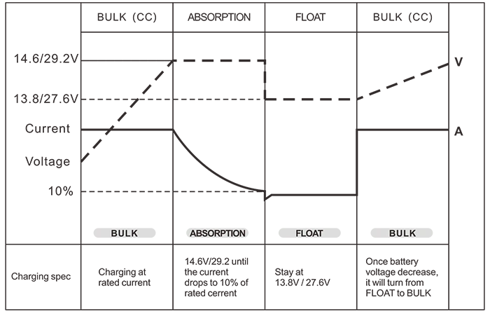 Nadzor baterije (3-stopenjski polnilniki baterij) Razsuti tovor / absorpcija / lebdenje